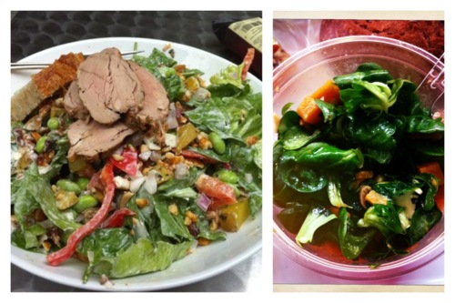 Exhibit A: American salad from Mixt Greens in SF on the left, complete with something like 16 servings of greens, 4 servings of pork, and a ton of creamy dressing. Exhibit B: French salad from Eric Kayser on the right with 1 serving of greens, 0 servings of meat, 1 small triangle of cheese, a few diced sweet potatoes, and probably a half teaspoon of olive oil.