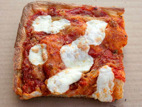 Another little factoid for you: the blend of cheeses they use isn’t spread across the pizza in any kind of uniform fashion, which means that their tangy-delicious sauce can get a little uncontained and runny, making for a nice, messy, oozy slice. (I love that.) And one more word on the crust: if thin and light’s your thing, pass on this. This crust is thick and crunchy (deep-fried TWICE in case you forgot) and a couple of times it was too hard to even eat, but my overall experience has been good enough to keep me coming back.